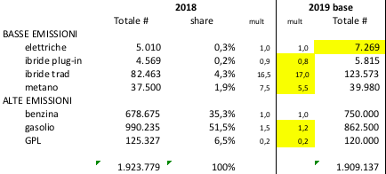ovvero uno scenario “base” che prevede immatricolazioni 2019 poco inferiori a quelle 2018, ma con una distribuzione leggermente diversa.
