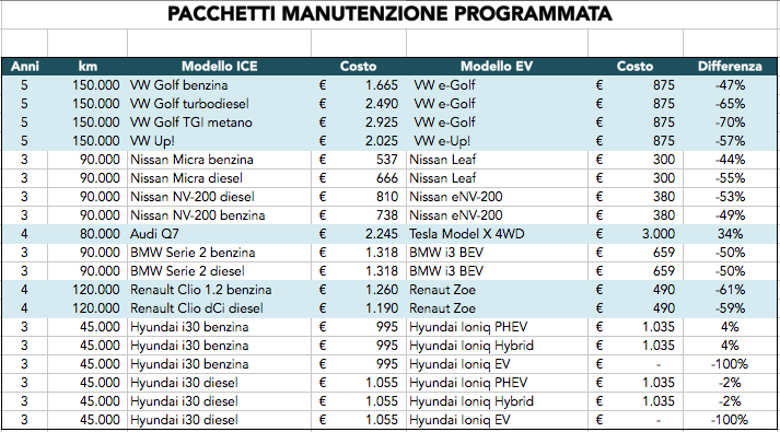Nor the after sales services sector will fare much better: in this table we collected programmed maintenance costs as quoted by the carmakers themselves, comparing each EV model with its ICE equivalent, showing decreases ranging from 50% to 100%.