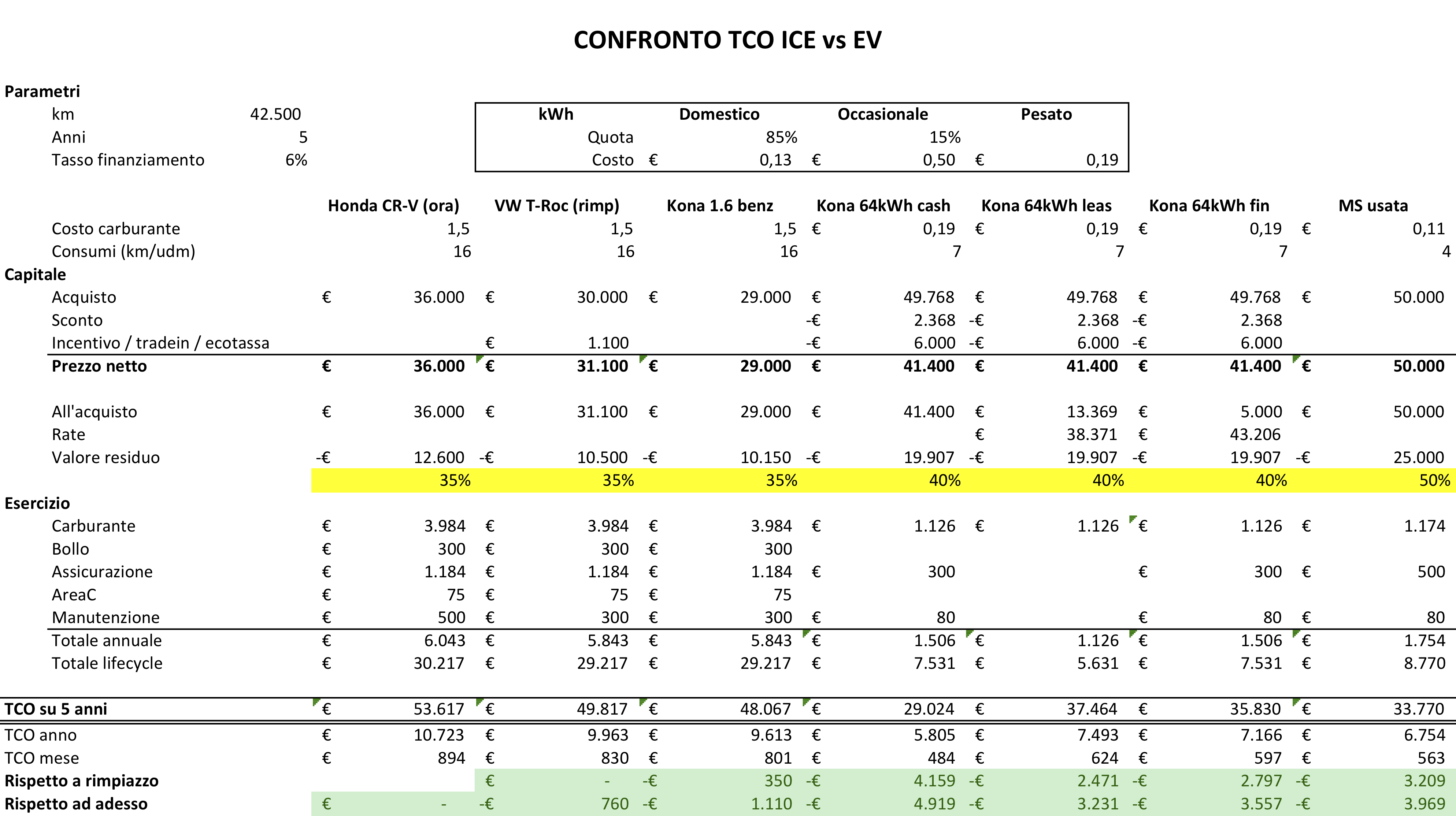 Ho analizzato il Total Cost of Ownership di diversi scenari di sostituzione usando quale parametri quelli della mia situazione specifica (carica quasi sempre domestica, spesso con fotovoltaico) raffrontandoli con il TCO attuale con la Honda CR-V 2.2 diesel: