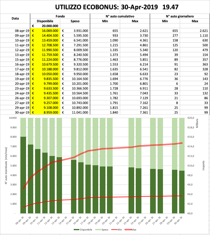 Per valutare l’impatto della misura incentivante, si consideri che il tasso di crescita senza ecobonus delle immatricolazioni di EV a fine 2018 era arrivato intorno al 150% (poi calato nel primo trimestre 2019 per l’attesa dell’incentivo); applicando questo tasso di crescita, le immatricolazioni BEV del 1° semestre 2019 sarebbero dovute essere pari a circa 3.300 unità; considerato che nei primi tre mesi ne sono state immatricolate 1.150, il saldo del secondo trimestre si sarebbe dovuto assestare intorno alle 2.150 unità (equivalenti a 30 BEV + 30 PHEV al giorno) che potrebbe essere il valore di riferimento su cui valutare l’impatto dell’incentivo che perciò sarà riuscito ad accelerare il processo solo se le immatricolazioni saranno superiori a questo valore.