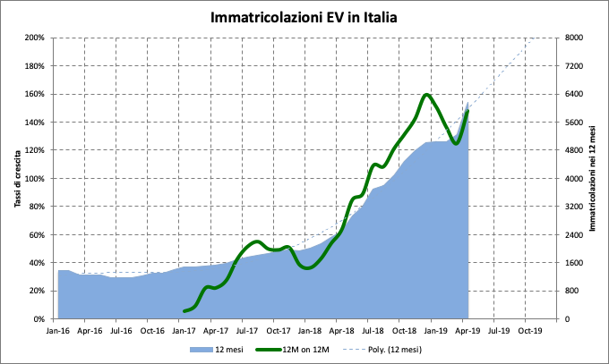 Infatti, se esaminiamo i primi 4 mesi dell’anno, vediamo 2.343 immatricolazioni che rispetto alle 1.185 dello stesso periodo del 2018 rappresentano un incremento vicino al 100%, ovvero ancora lontano dal tendenziale 130% – 150% raggiunto a fine 2018.