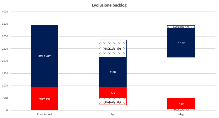 Le immatricolazioni segnano il passo (relativamente parlando) con 1.167 unità elettriche nel mese di Maggio, che rappresentano un incremento del 91% rispetto alle 609 di un anno fa; il valore buono è però stato ottenuto riassorbendo – come vedremo più avanti – il backlog di ordini non evasi accumulato in Aprile.