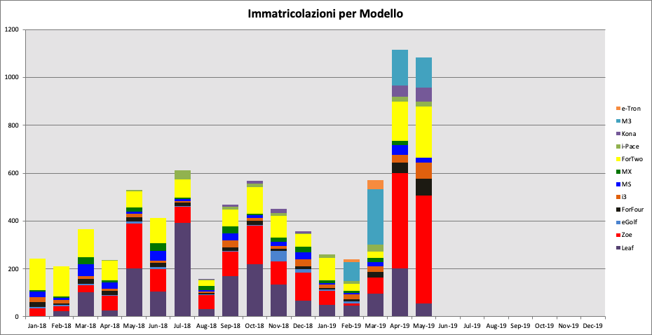 Sul cumulato annuale Zoe sfiora le 1.000 unità seguita dalle quasi 600 di Model 3; terza la ForTwo con 522; a seguire Leaf (451) e Kona (240).