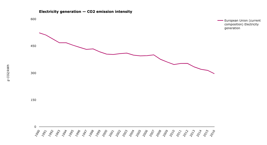 Evidentemente neppure Luciano si prende il disturbo di controllare i dati che riceve nei comunicati stampa, e allora lo facciamo noi per lui: se è vero che la maggioranza dell’energia elettrica proviene da fonti fossili (ma in UE siamo siamo al 71%, non l’80%) quello che dovrebbe interessargli è l’andamento delle emissioni che, negli ultimi 25 anni, è letteralmente precipitato da oltre 500 g CO2 / kWh a meno di 300: