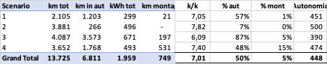 Ho pensato di dedicare questo post a sviscerare un po’ più in dettaglio il tema dei consumi: ogni giorno rilevo kilometraggio e carica (sia dal computer di bordo che dal wallbox o Fast esterna); inoltre ho individuato finora 4 scenari distinti di utilizzo, e precisamente: