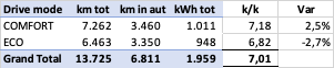 Ho visto che “accorpando” i tre percorsi misti (Salita / Discesa e SALITADiscesa) si ho 8,77 Kw/100 km quasi meglio della pura pianura (!)