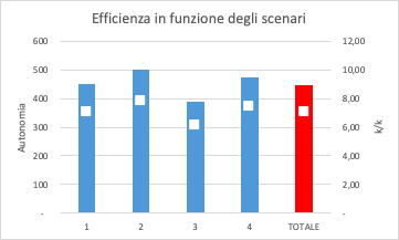 - Autonomia = è ottenuta moltiplicando il valore di k/k in ciascuno scenario per la capacità della batteria (64 kWh)