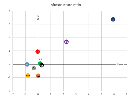 Il grafico si legge così: all’origine degli assi vi sono i valori medi di numero di abitanti per ciascun caricatore veloci (asse verticale) o lenti (asse orizzontale). Il paese che si trova a destra (o sopra) di un altro ha MENO caricatori installati dell’altro.