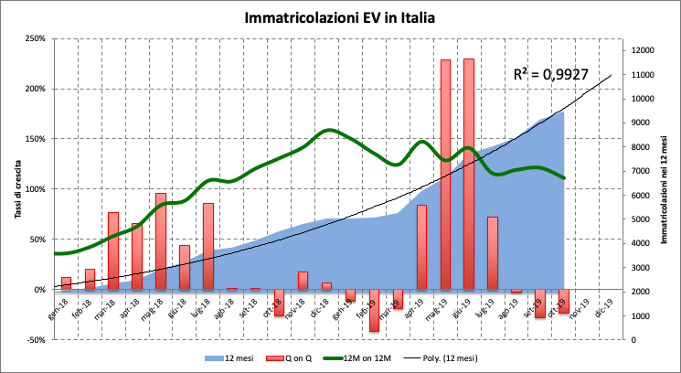 Le elettriche fanno benino ma niente di entusiasmante: il tasso di crescita sui 12 mesi si avvia a stabilizzarsi verso il 100%, il che porterebbe la stima sulle immatricolazioni nell’intero 2019 un po’ al di sotto delle 11.000 unità prevedibili fino a ieri.