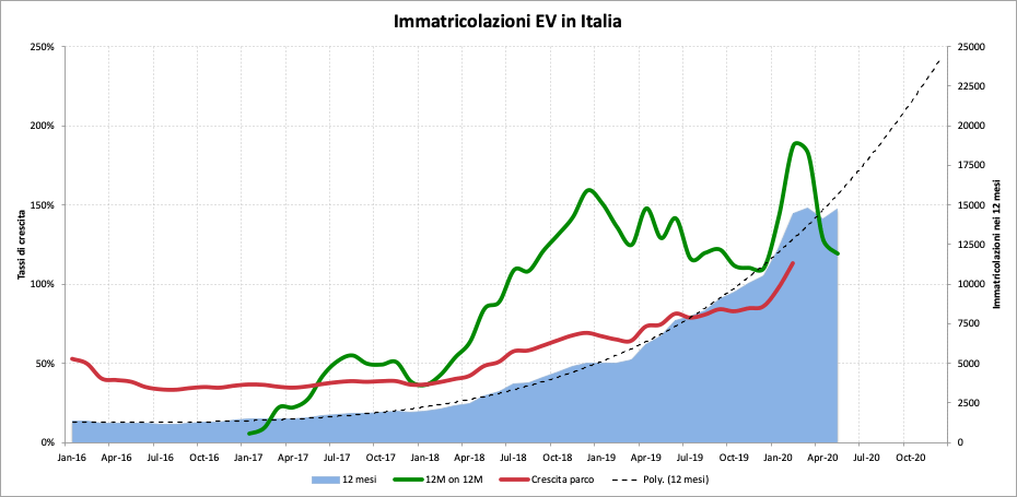Sui dodici mesi siamo rimasti sui livelli di crescita medi registrati l’anno scorso (+120%) ma tutto fa presagire che nel resto dell’anno il mercato si porterà su livelli anche più importanti (consegne permettendo), permettendo di puntare verso quota 25.000 e forse qualcosa di più.