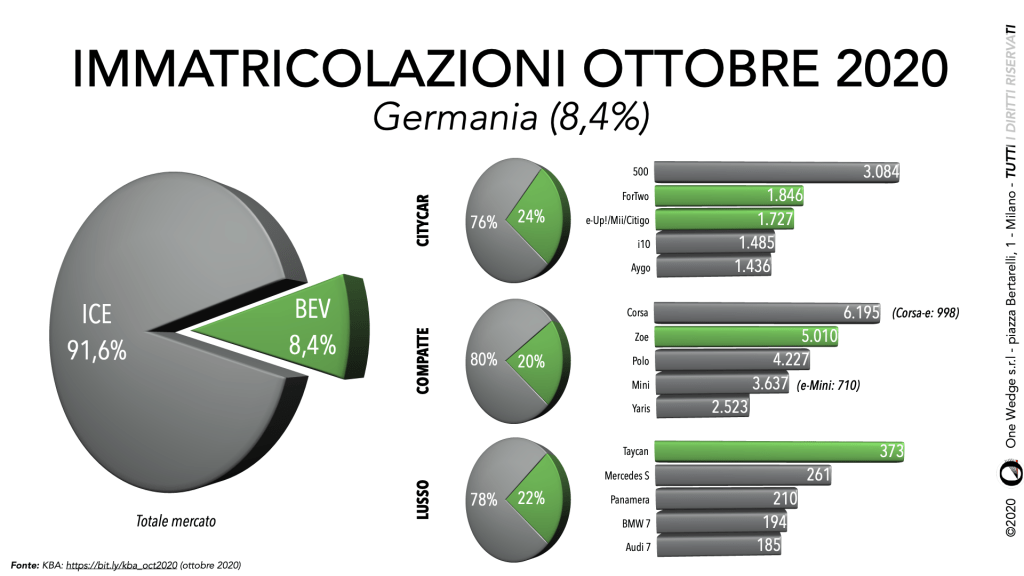 Nel mese di ottobre in Germania sono state immatricolate 23.158 vetture BEV (cioè 100% elettriche) su un totale di 274.303 il che rappresenta una quota di mercato dell’8,4%: circa il doppio del quota che ha in Italia, dunque un valore tutto sommato confrontabile e “al di qua” della soglia indicata sopra.