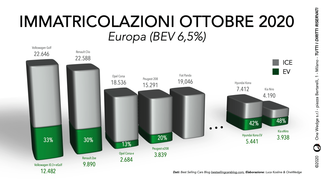L’effetto dell’introduzione dei primi modelli elettrificati su un segmento finora termico è dirompente, lo possiamo misurare facilmente se osserviamo l’andamento delle vendite in Europa: la quota di mercato elettrica ad ottobre è stata del 6,5%, ma per i modelli che potevano offrire una versione elettrica (ancorché magari con una denominazione diversa) la quota elettrica schizza molto rapidamente oltre il 30%.