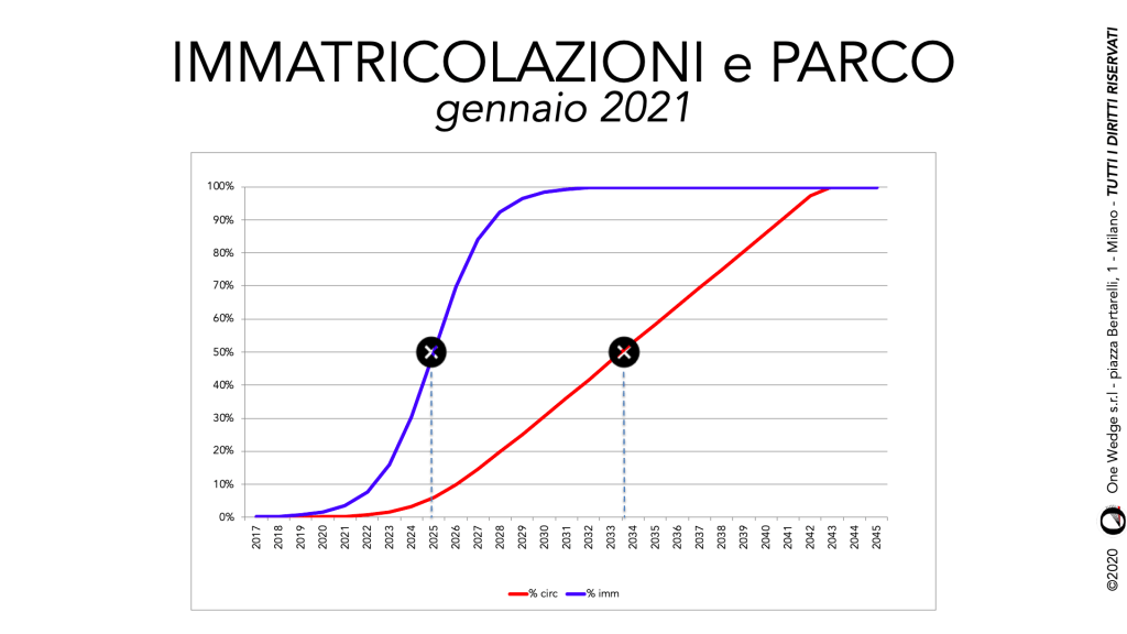 La previsione della curva per il 2021 si assesta ora intorno al valore di 70.000 nuove immatricolazioni, il che porterebbe il parco circolante BEV al valore di circa 120.000 veicoli.