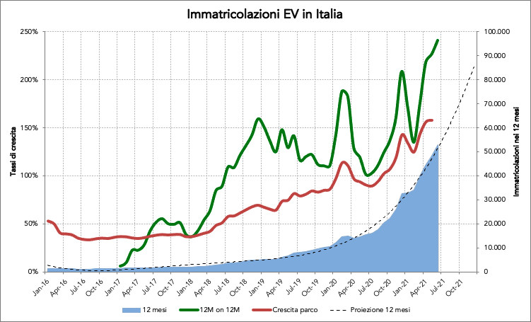 Nell’ambito delle auto alla spina, le elettriche pure registrano un discreto 7.025 immatricolazioni (quasi il quadruplo del 2019 e oltre il doppio dell’anno scorso) mentre le ibride plug-in moltiplicano le vendite per 17 !! Insomma, si cresce bene, ma Giugno che è tradizionalmente il mese più forte prima dell’estate non è stato particolarmente generoso, e il traguardo delle 70.000 immatricolazioni nell’anno continua a sembrarmi il valore di riferimento, nonostante quello che afferma il grafico tendenziale.