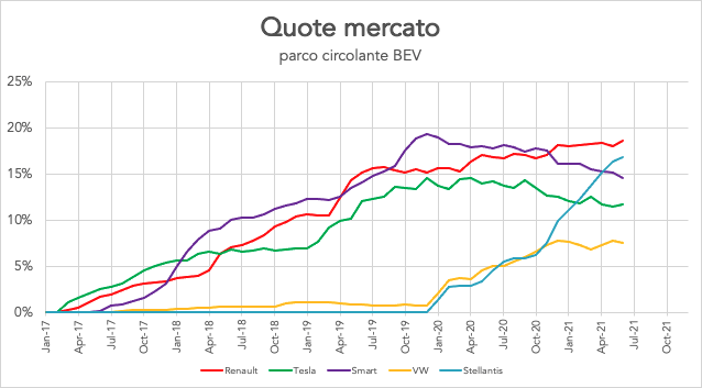 In fondo alla classifica si distingue un altro mese non entusiasmante per il gruppo Volkswagen che, nonostante un’offerta nutrita rimane intorno al 7-8% di quota di mercato complessiva. Segnaliamo da ultimo che la venerabile Nissan Leaf rischia di uscire dalla Top Ten, in attesa dei nuovi modelli della Casa giapponese.