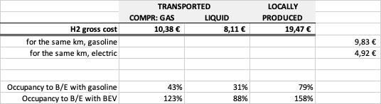 Lastly, I have reversed the calculation to derive what the occupancy rates should be to achieve parity with the other fuels: as you can see, breaking even with gasoline requires very high but possible occupancy rates, while parity with electricity can only be achieved by selling more fuel than the theoretical maximum: in other words, it’s completely impossible.
