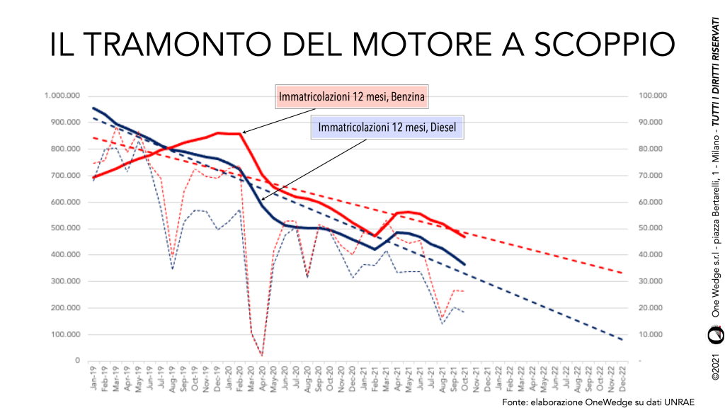 Insomma, tra 12 mesi potremmo accorgerci che in Italia si sono immatricolate meno di 100.000 vetture diesel e 200.000 a benzina.
