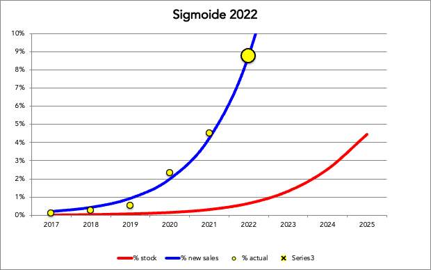 - il 100% si raggiunge molto prima (intorno al 2033 invece del 2050) ed il punto di flesso (metà immatricolazioni elettriche) arriva già nel 2025