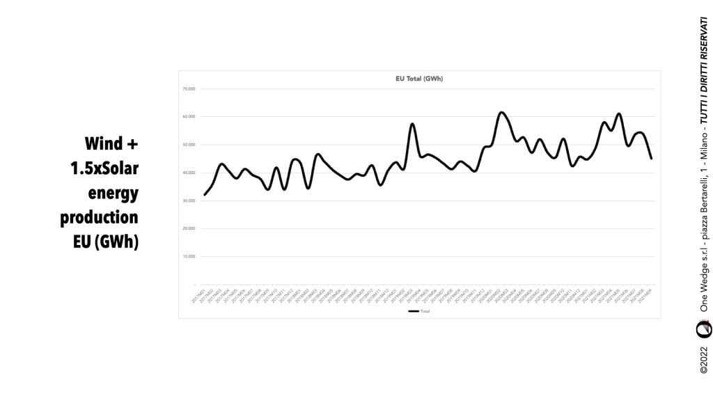 This charts (sourced from Eurostat) represents the combined generation from the EU 27 members of renewable energy, should we ramp up PV installations by a measly 50%: since the peaks and valleys of wind and solar are essentially in opposition, you can see the aggregate energy generated is not at all as variable as we’ve been lead to think.