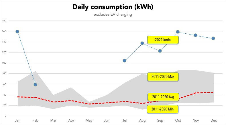 E come no. Questo grafico rappresenta il consumo giornaliero medio della mia casa nella decade 2011-2020 (la linea tratteggiata rossa): a luglio 2021 il mio inverter si è guastato e non ho potuto ripararlo fino al gennaio successivo: la curva blu rappresenta il mio consumo in quel periodo, il che dà un’idea di quanto prelievo io eviti grazie al mio impianto fotovoltaico.