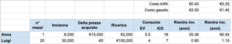 Invece Luigi ha una impresa di consegne a domicilio gestita con una ventina di furgoni in Noleggio a Lungo Termine: il differenziale nel prezzo di acquisto nel suo caso è praticamente nullo, anche se deve affrontare la spesa per dotare il suo parcheggio di un buon sistema di ricarica professionale che gli consenta di trovare i furgoni sempre carichi al mattino.