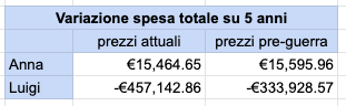 Proviamo a fare i conti in tasca a ciascuno dei due, sia con i prezzi attuali che con quelli pre-guerra, e otteniamo questa tabella:
