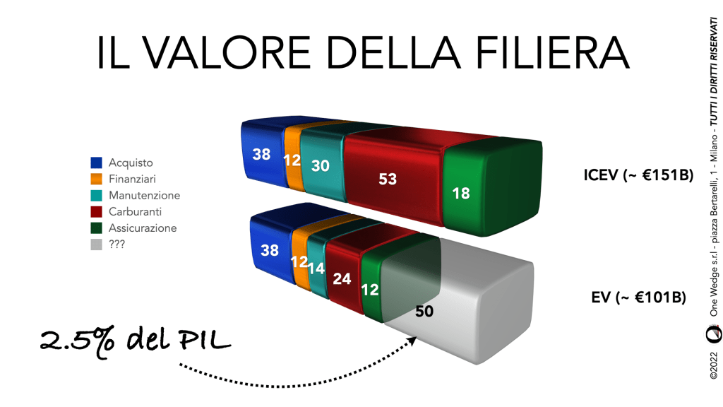 Dunque possiamo dire che, usando 3/4 meno di energia, si risparmieranno più o meno i 3/4 delle emissioni nocive. Ma soprattutto possiamo dire che si risparmieranno i 3/4 dei costi, e questa è la circostanza più importante: se infatti esaminiamo la filiera nel suo complesso scopriamo che la riduzione nella spesa per carburante è la caratteristica più macroscopica della filiera automobilistica elettrificata: