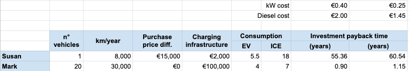 Our other example is Mark, whose last-mile delivery business uses 20 vans which he provisioned through Long-Term Rental: his purchase price differential is practically nil, but he will need to foot the bill of a professional-grade charging infrastructure in his parking lot to make sure his vans are fully charged every morning.