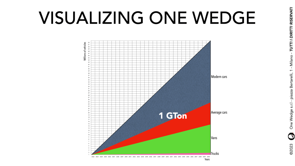 According to numerous scientific studies (a partial collection is here), an electrified vehicle reduces the emissions associated to its lifecycle by two thirds, so not all vehicles contribute in the same way, and the same billion tons can be achieved with vastly different volumes: in the chart below, each triangle’ area represents 1 billion tons of CO2 not emitted.