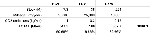 If, however, we take the total stock of passenger cars, vans and trucks in Europe (from ACEA), multiply by their average mileage and emissions per km we get a rather different picture: