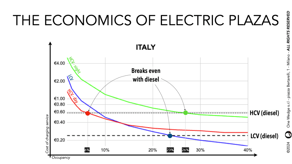 But, as we said at the beginning, this does not means that all necessary Electric Plazas will be built, because fleet operators demand a cost of fuel that is AT MOST on a par with diesel, capital needs to be rewarded (imagine if we were to take out a loan from a Bank) and the Charge Point Operator needs to obtain a profit to sustain its operations.