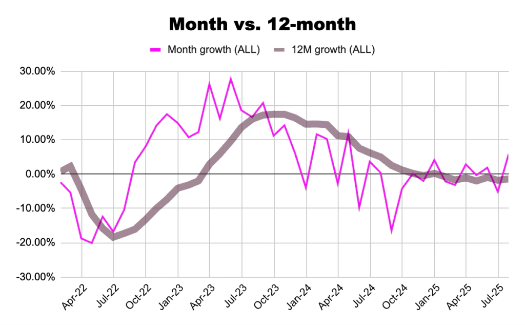 3°: destagionalizzazione – i dati vengono rilevati mese per mese, ma trovo che l’oscillazione del singolo mese (che può dipendere dal lancio di un nuovo modello, o dall’entrata in vigore o chiusura di programmi di incentivo) per non parlare della stagionalità naturale del mercato, mascherino troppo le tendenze di lungo periodo e dunque preferisco destagionalizzare, sommando i dati dei 12 mesi precedenti. A mo’ di esempio, si consideri questo grafico: la linea rosa sottile rappresenta il tasso di crescita delle immatricolazioni mese per mese, mentre la linea rosa scuro più spessa rappresenta il valore destagionalizzato, cioè una volta rimosso il rumore di fondo: è evidente che i grafici aritmeticamente rappresentino la stessa realtà, ma la linea più spessa evidenzia in modo molto più efficace la tendenza in atto.