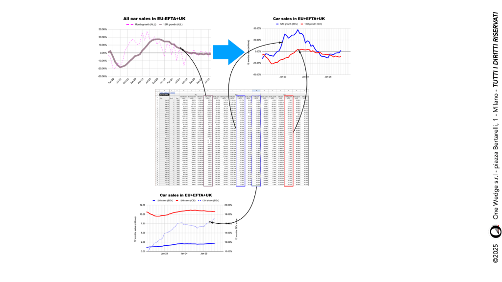 Come si vede, tutte le scelte metodologiche sono chiaramente indicate nei titoli: si può condividerle o meno, ma non sono certo nascoste. Inoltre, si vede bene che scomponendo la curva di crescita destagionalizzata (quella rosa scuro della prima illustrazione) nelle due componenti ICE e BEV si mette in luce un andamento molto diverso delle due componenti: dalla curva aggregata (rosa), infatti, potrebbe sembrare che le immatricolazioni auto si siano assestando su crescita zero, nascondendo il fatto che la crescita negativa sulle ICE (rossa) è negativa, e viene compensata dalla crescita positiva delle BEV (blu) creando l’illusione.