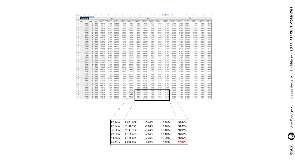 Infine, per la tranquillità di chi dubitava, è sempre da questa tabella che viene anche il dato del 17,27% di quota BEV sul totale calcolato, com’è a mio parere corretto fare, sui totali dei 12 mesi precedenti.