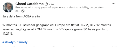 Tre righe accompagnate da due grafici (che commento in coda) per sottolineare che le tendenze in atto da diversi mesi si confermano anche nel mese di luglio: le auto a combustione interna (ICE) continuano il loro lieve calo, mentre quelle elettriche (BEV) la loro altrettanto lieve crescita. Sono numeri, c’è davvero poco da discutere, ma questo non ferma i troll: alcuni non contribuiscono altro che insulti (basta ignorarli), ma altri insinuano il dubbio che i dati siano errati, e questo non può essere ignorato.