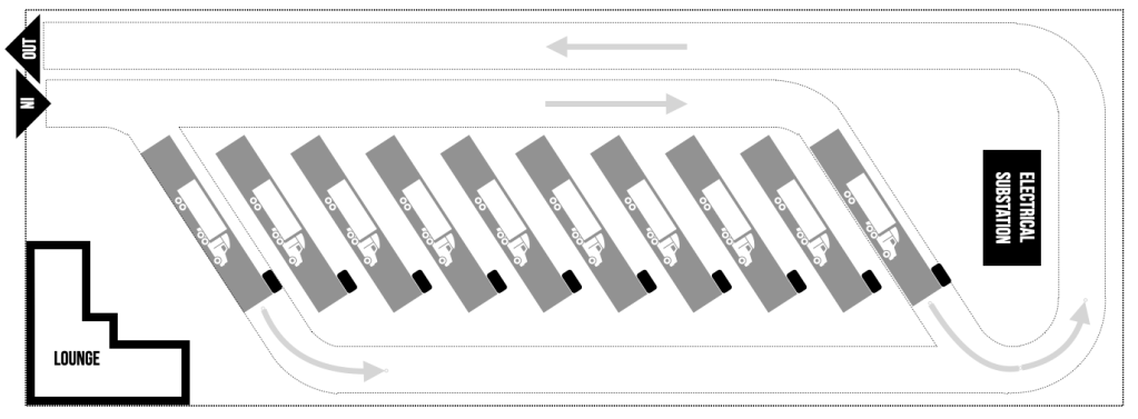 Typical layout for a 10-stall 5,000 sqm HCV Electric Plaza (not at scale)